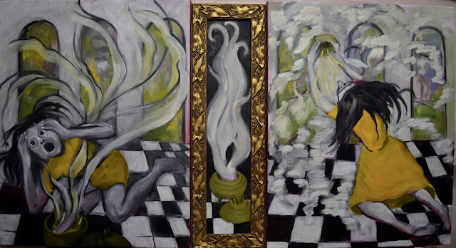 It's dripping because, a) the canvas is large, 48” X 48”, and I’m the only human in the mix, so I must reach across. (Dealing with gods is always a problem) and b) over the past several months I’ve developed a growing difficulty with my right bicep. According to YouTube doctors I have either bicep tendonitis (which I’m going with) or something called a ruptured bicep. Well, I can still move and use my arm, so it’s not really a problem except when doing housework (;-))) like none, okay?) or reaching across a 48” canvas with a brush full of loose paint.